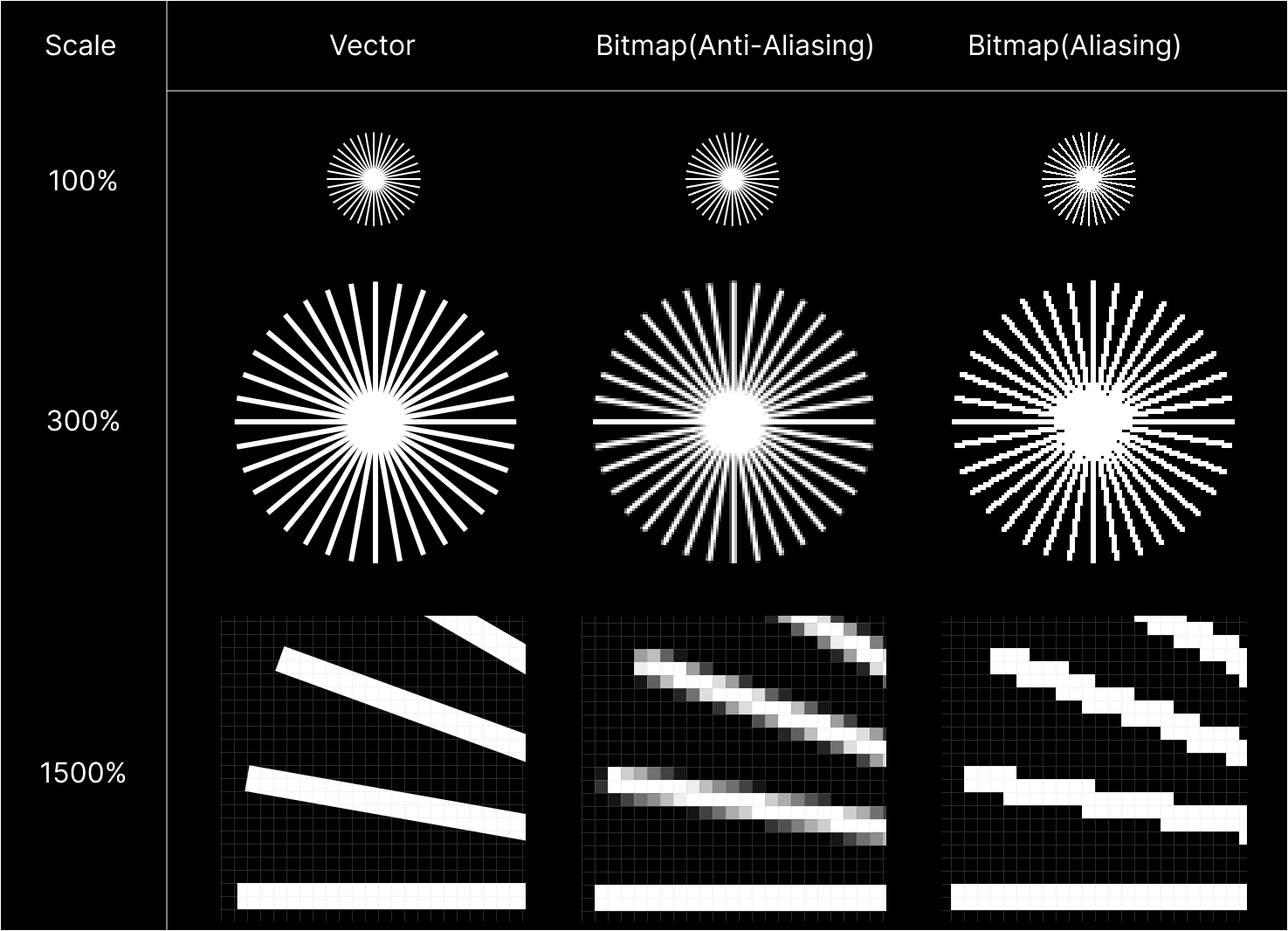 - Bitmap Aliasing: 비트맵 선이 고정된 픽셀 격자에서 계단 현상(Jaggies)을 보입니다.