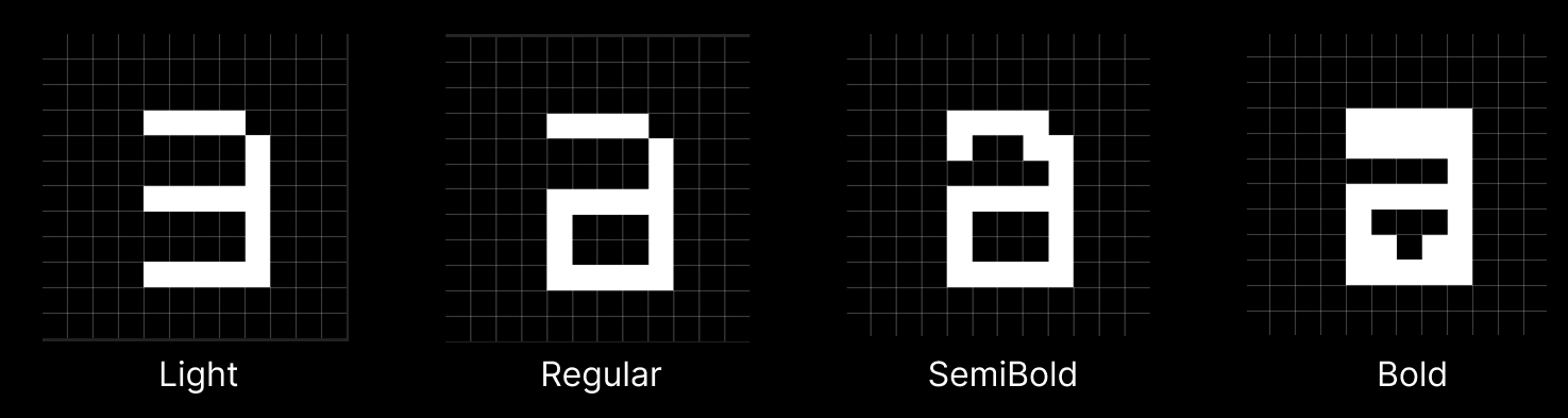 포토샵에서 12x12 픽셀 공간에 12pt 벡터 폰트를 4가지 굵기로 적용하고 안티앨리어싱 옵션인 “Font smoothing”을 “None”으로 설정한 결과입니다.