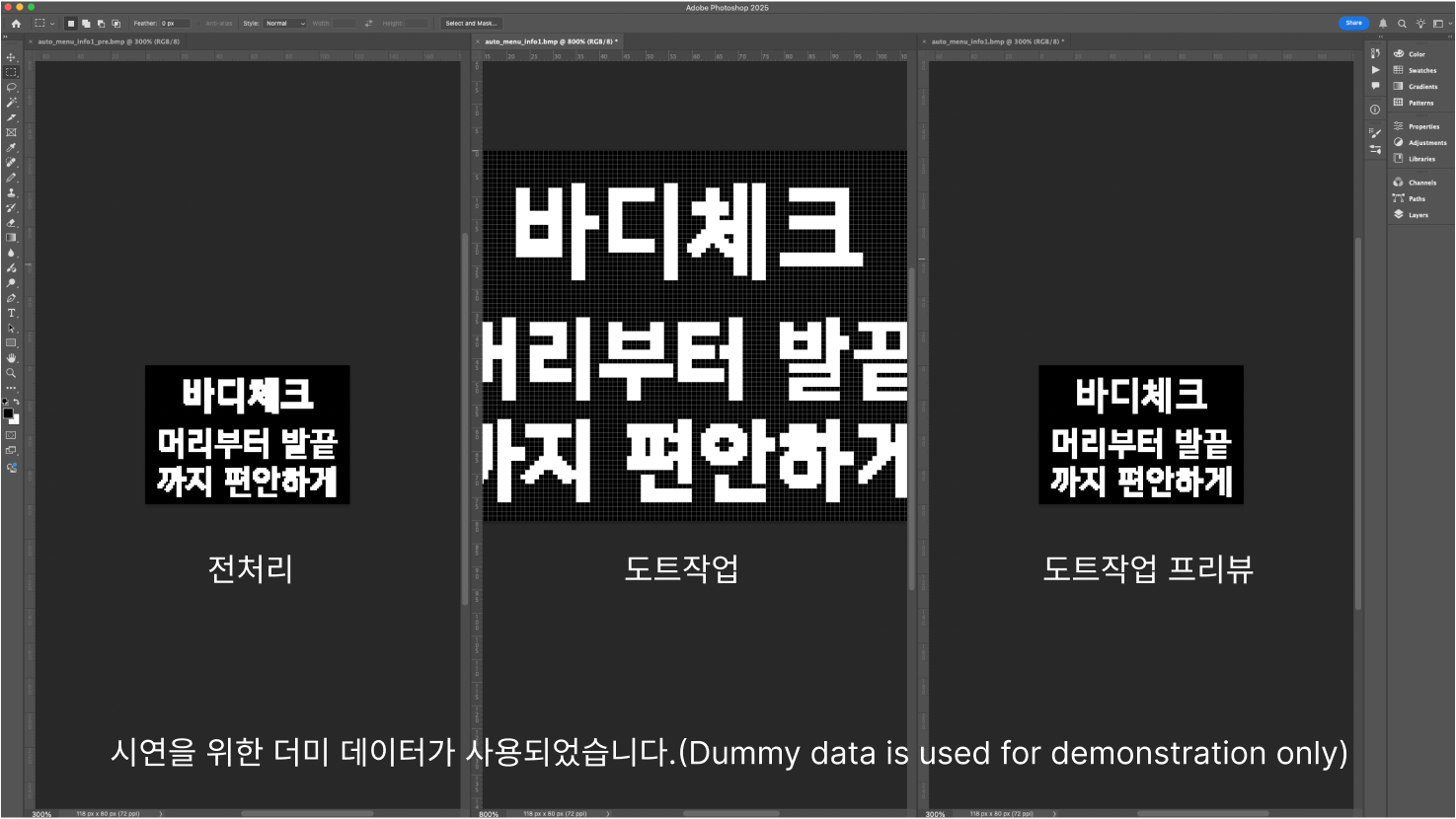 자동화(Batch)를 사용해 전처리 작업을 합니다. 비트맵 전환 시 획이 뭉치거나 사라지는 현상을 최소화하고 최종 산출과 유사한 형태의 도트 작업 이미지를 준비합니다.