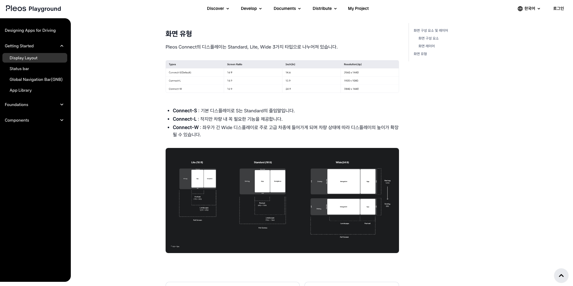 화면은 16:9를 기준으로 하고 있으며 레이아웃은 Pleos에서 플랙서블하게 맞춰준다고 함 (이는, Android의 support-different-display-sizes와 같은 개념이다.) 플레오스 개발자 사이트에 디자인 가이드가 있습니다. 자세한 내용은 디자인 가이드를 참고하기 바랍니다.(https://pleos.ai/playground/resources/docs/docs-design-pleos/intro)