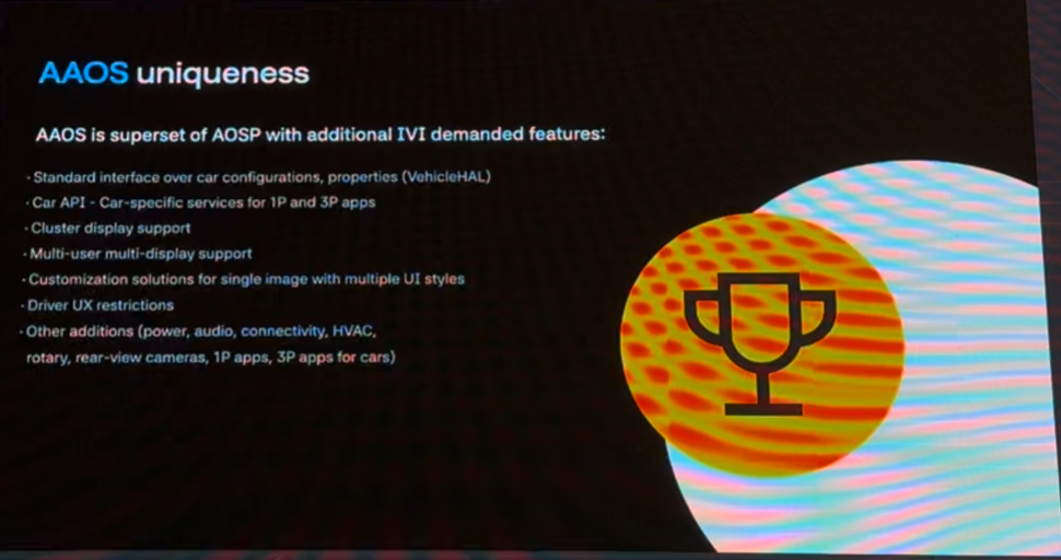 비유하자면 스마트 폰에 바퀴가 달린 것이다. OS 업그레이드를 통해 새로운 기술을 사용할 수 있다. 데이터를 오픈해 서드파티에서 안드로이드 폰앱을 차량용으로 빠르게 확장하고 차량 환경에 최적화된 새로운 경험을 제공할 수 있게 되었다. 뿐만 아니라 Plug&Play로 자동차에 새로운 가젯을 쉽게 추가할 수 있게 되었다.